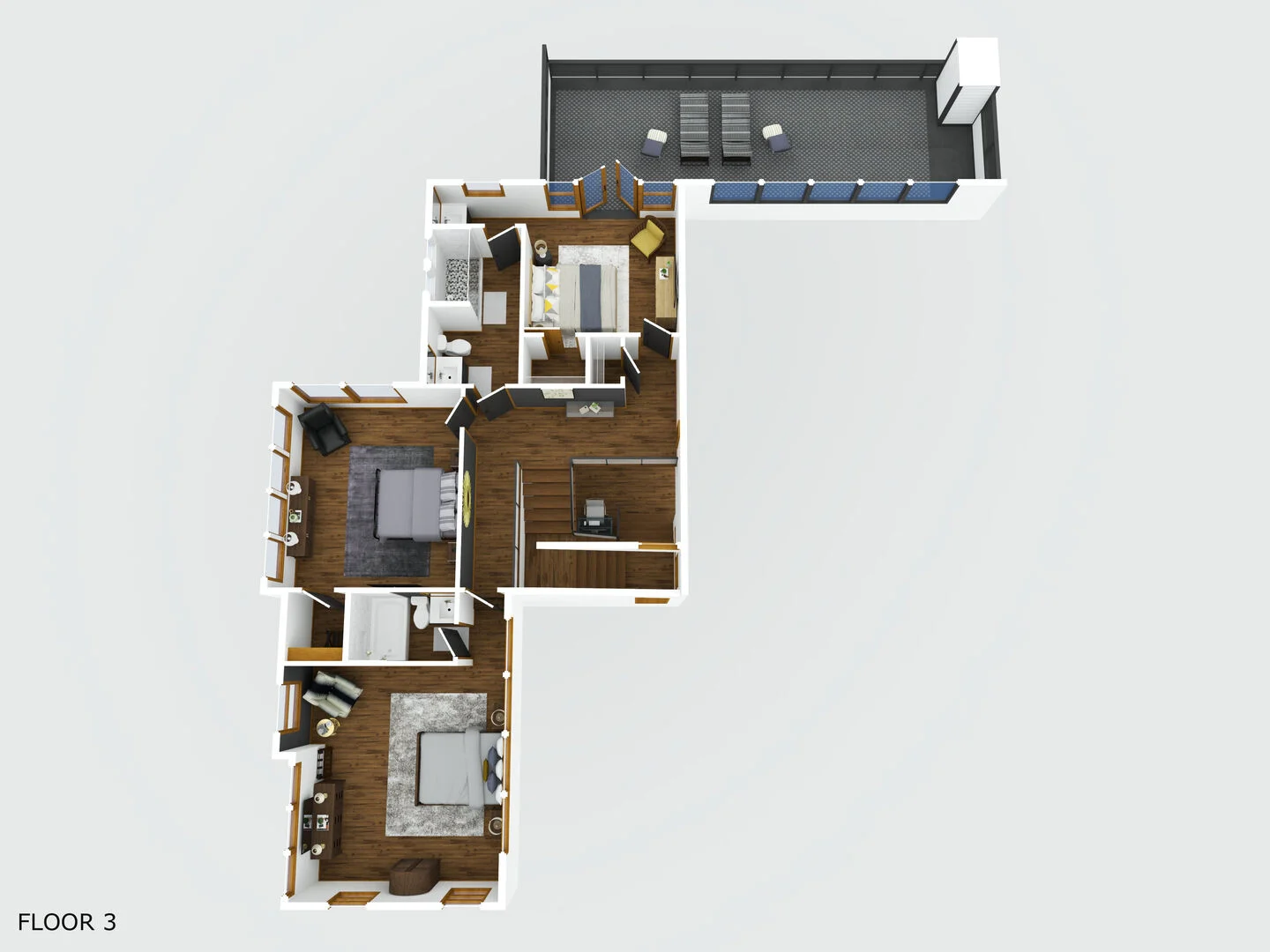 - Bedroom 4: Queen bed with private balcony access and Jack and Jill shared bathroom (walk-in shower) — connects to Bedroom 3