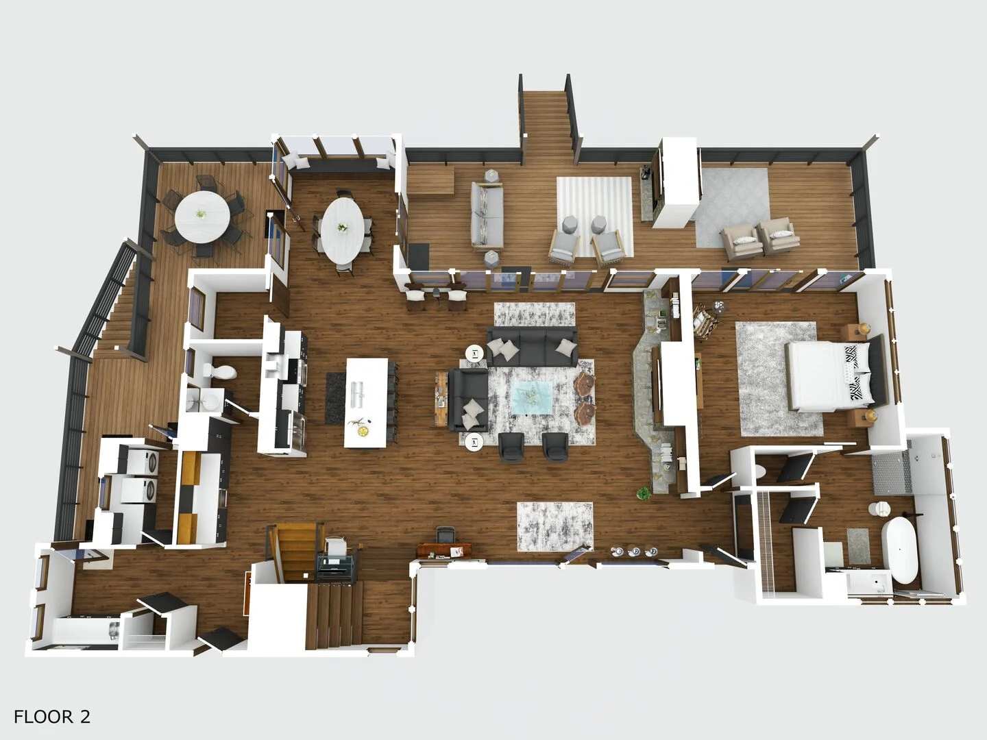 - Open-concept living and dining areas with seven Smart TVs throughout the home