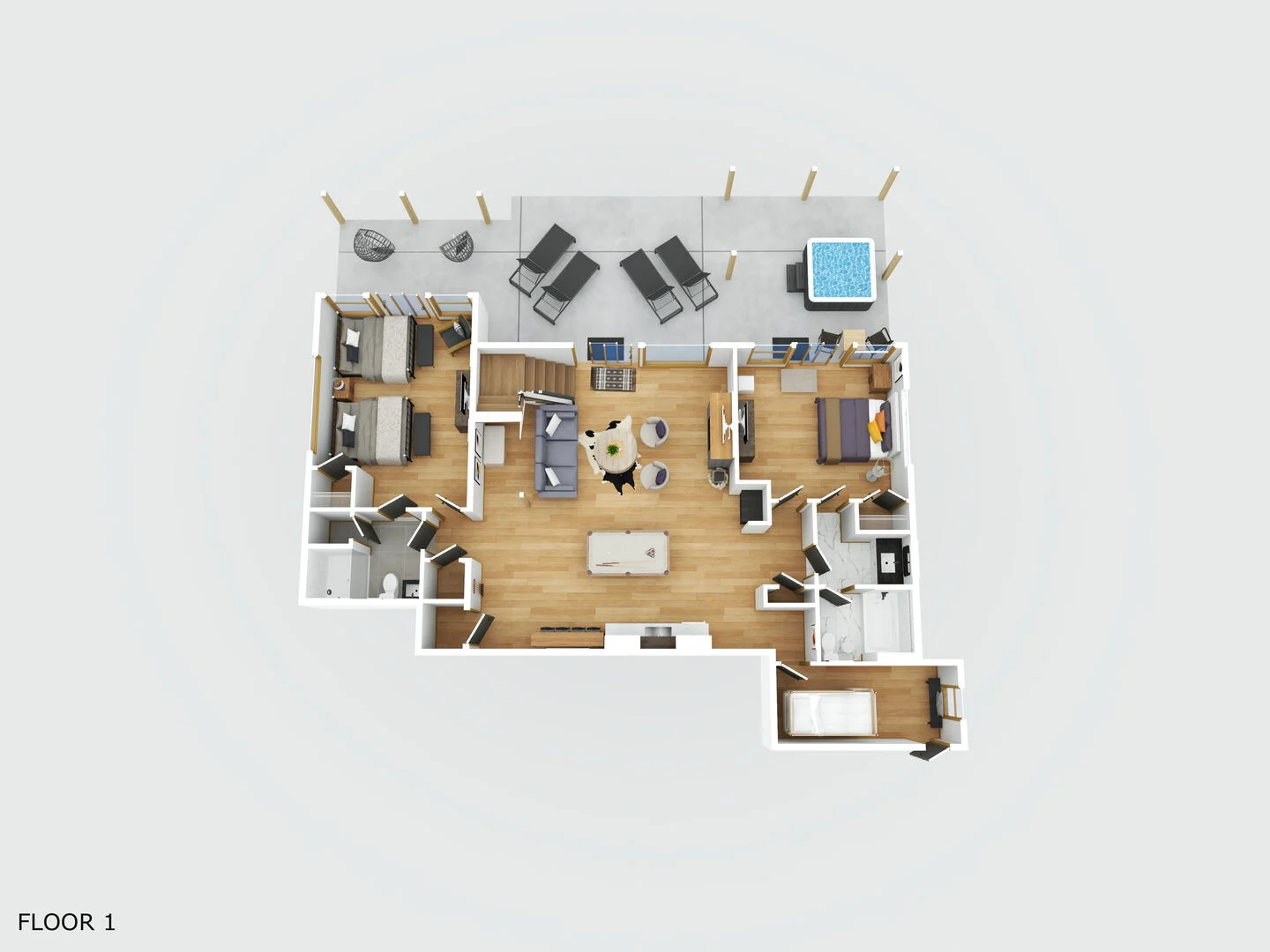 - Primary Suite 1 (Main Level) – King bed, en-suite bathroom