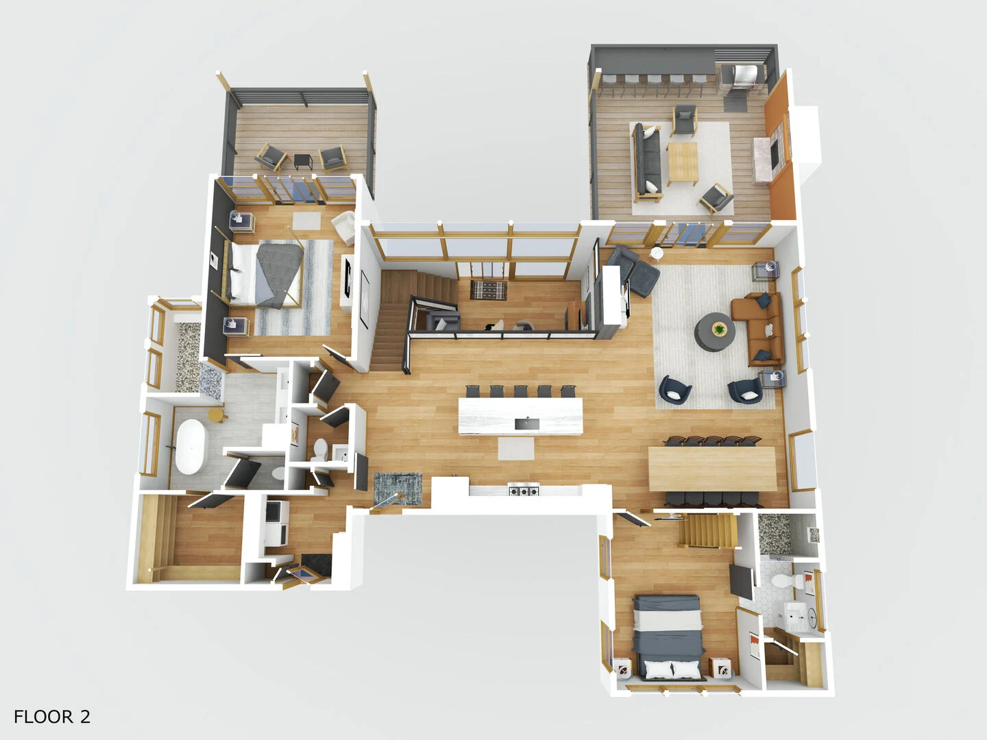 - Primary Suite 2 (Main Level) – King bed, en-suite bathroom