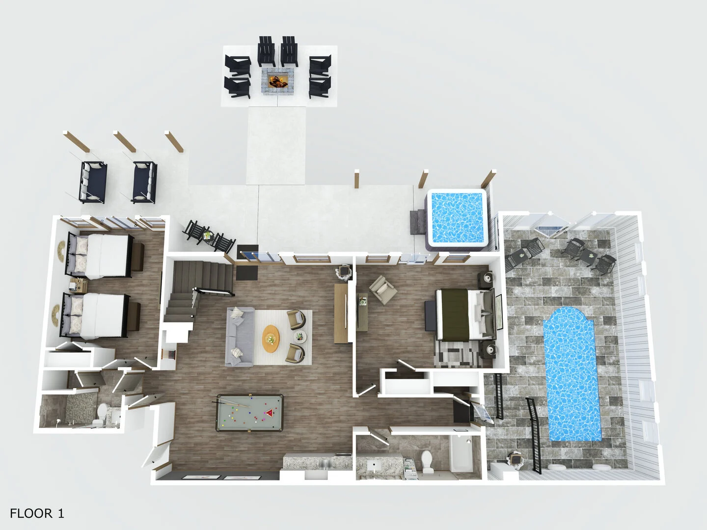 - Primary Suite 1 (Main Level) – King bed, en-suite bathroom