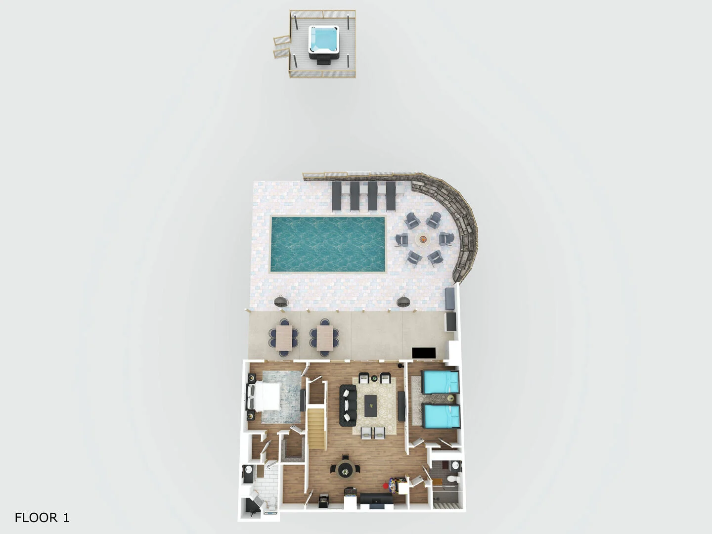 - Primary Suite 1 (Main Level) – King bed, en-suite bathroom
