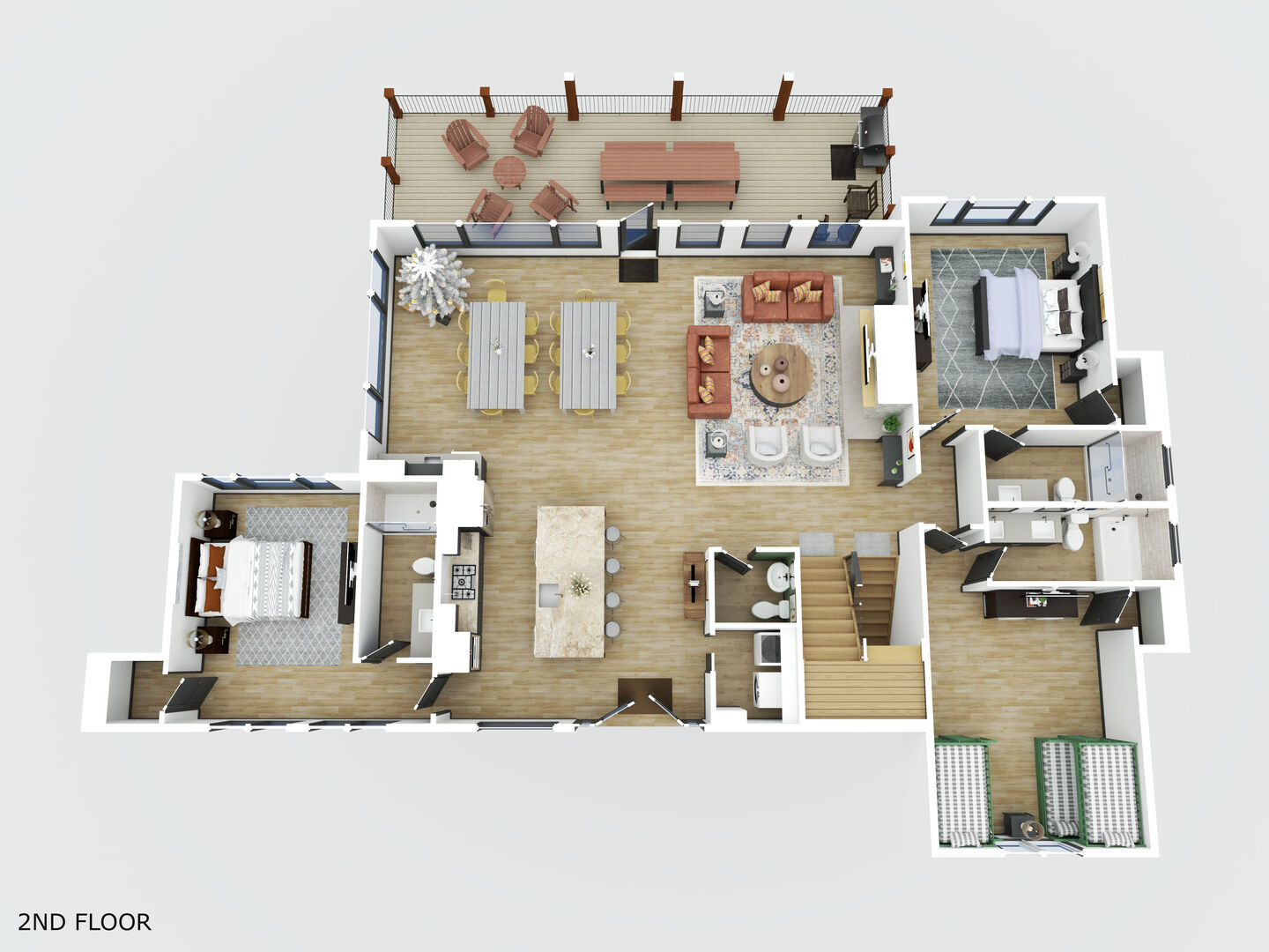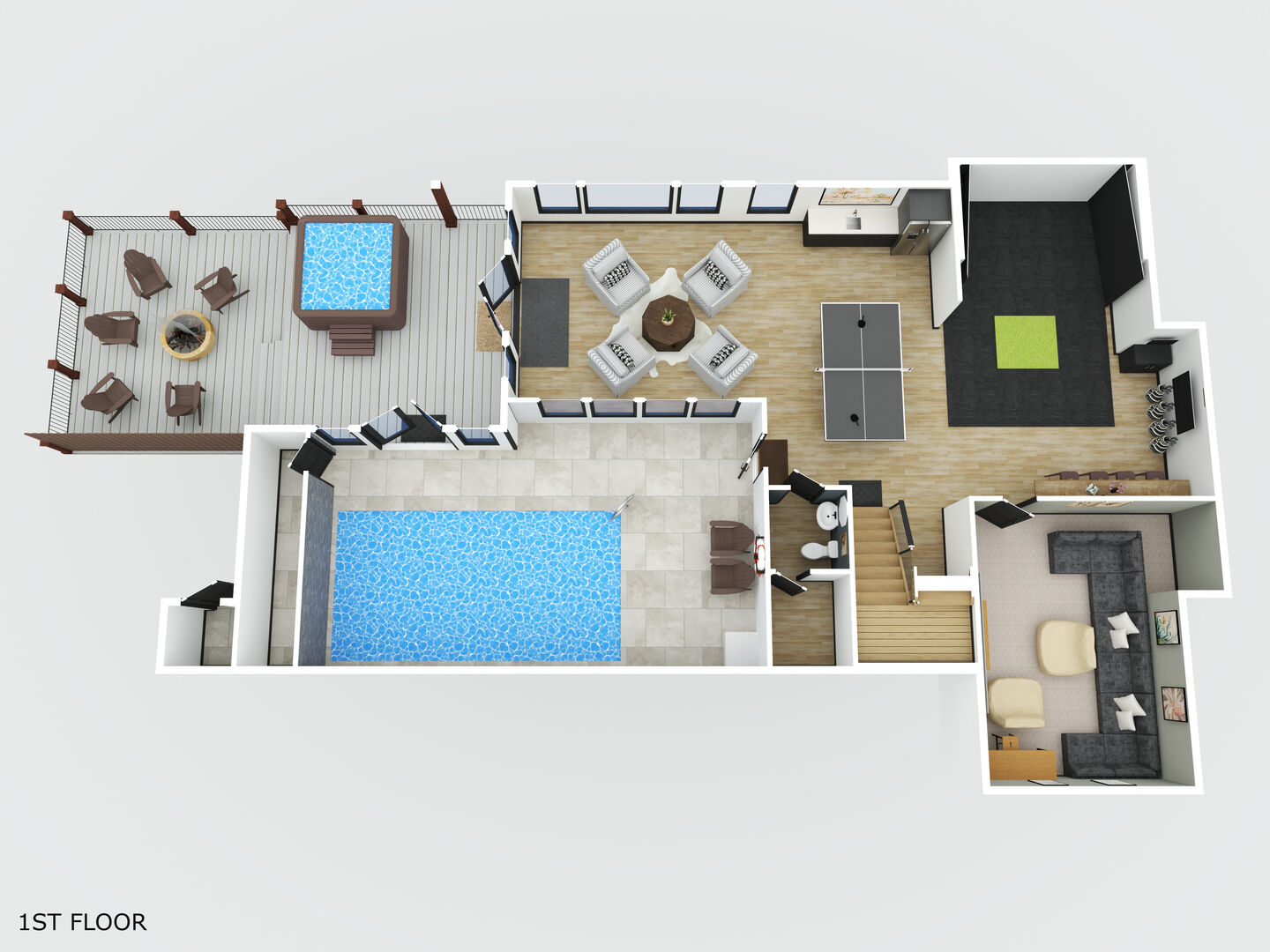 o Lower Outdoor Decks - As a seamless extension of the game area and pool, the Lower Outdoor Decks feature an oversized 8-person hot tub and a Resort-Style Gas Fire Pit. After an action-packed day of hiking, horseback riding, snow skiing, ziplining, or tubing down the river... this space is sure to be calling your name! Relax your muscles in the hot tub and then don your robe and sip on a glass of wine by the fire as you watch the sunset over the mountains.